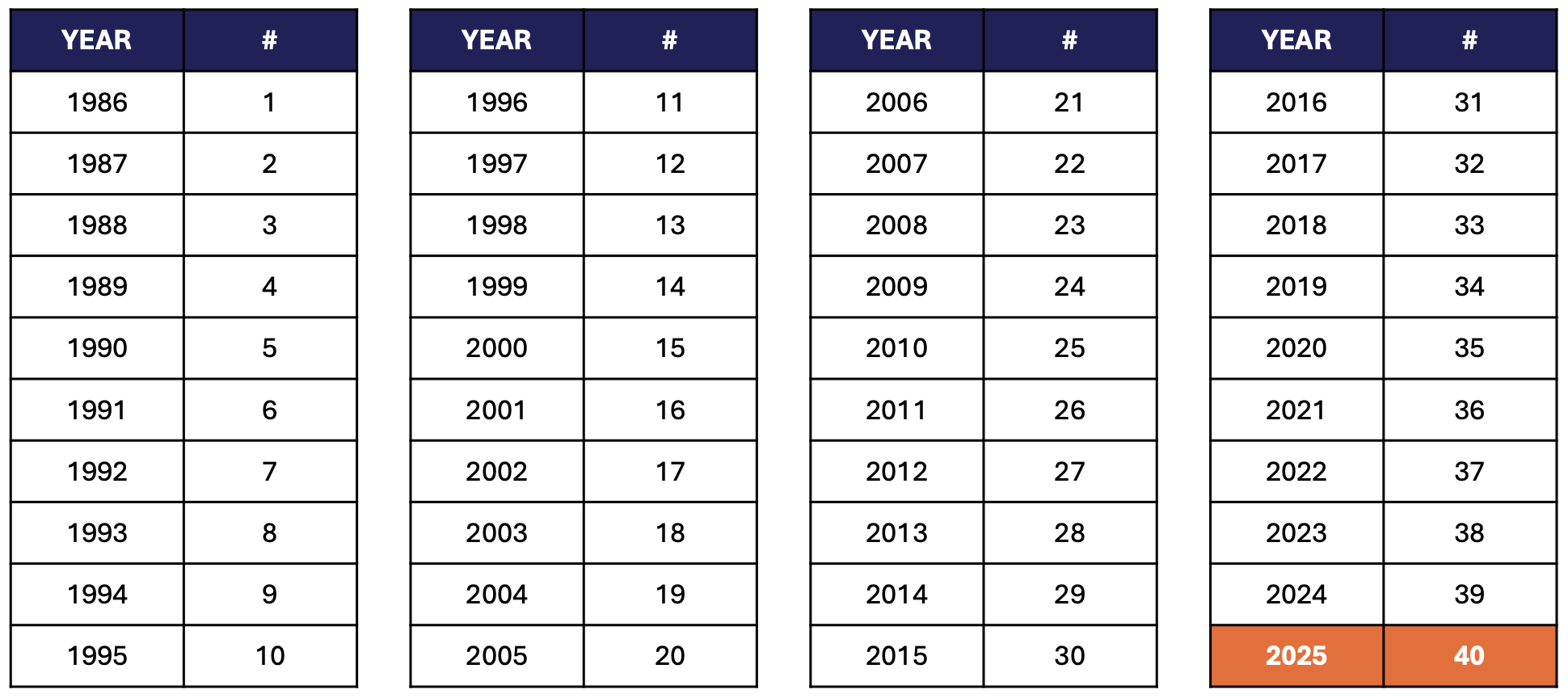 To help explain this, check out the table below. It shows the race numbers starting from 1 in 1986 all the way to 40 in 2025.
