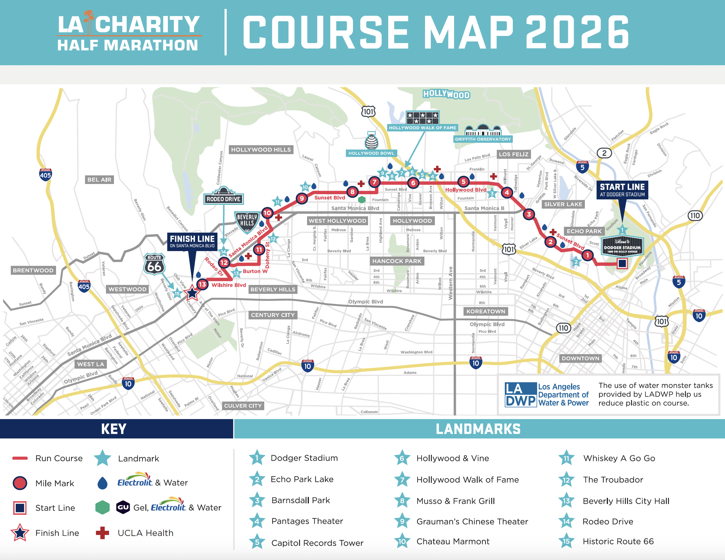 The ASICS Los Angeles Marathon’s Stadium to the Stars course starts at Dodger Stadium and takes you on a spectator lined 26.2 mile tour through LA’s most charming communities, past some of LA’s most iconic Landmarks, and finishes at our exciting Finish Line on Santa Monica Blvd at Avenue of the Stars.