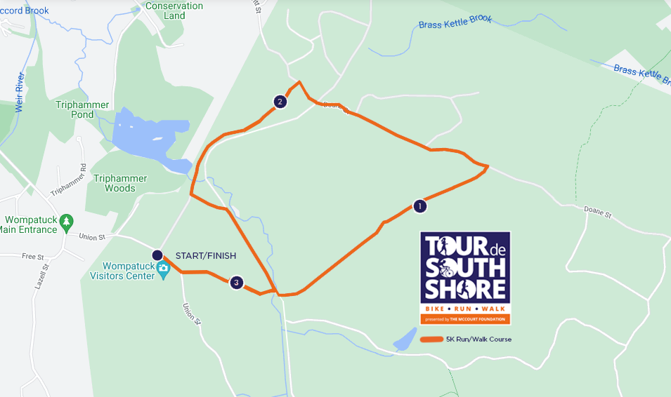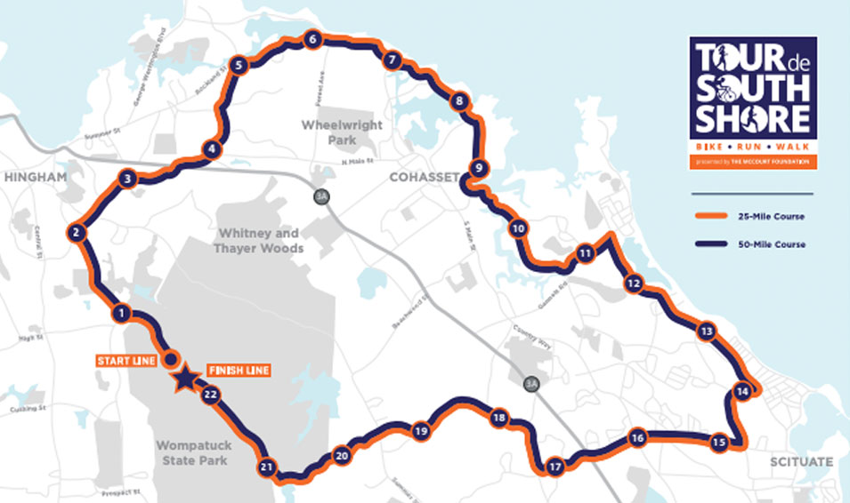 The Tour de South Shore 25-Mile and 50-Mile Bike Courses start and finish in Wompatuck State Park and boasts a scenic ride on tree lined streets and along the coast in Scituate, Norwell, Cohasset and Hingham.